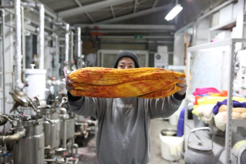岩本「ある程度は、考えた上でやるけど、たぶん20%くらいは偶然性も加味して。偶然性からしか面白いモノは生まれないから。色々な手法にしても、こうやったらこんな色になったわ、という偶然から。糸をラップ巻きしてやってみれば面白い色柄が出るんでは?とか。」