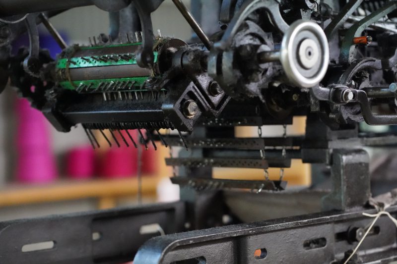 谷口「5、6台動かしている各機械で順番に糸交換が必要になってくるので常に近くにスタッフが控えておく必要があります。それ以外にもトラブルで糸が切れたりとかで機械が止まるんで、完全につきっきりになります。」
