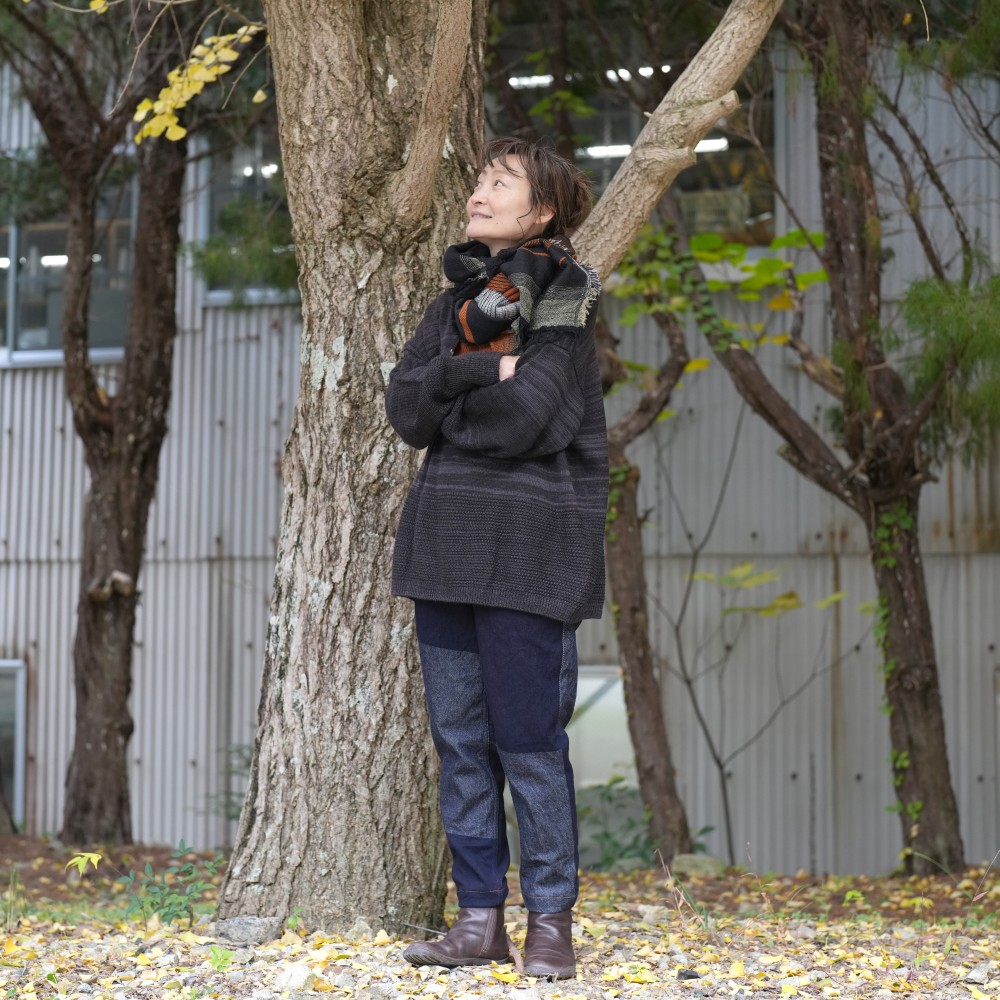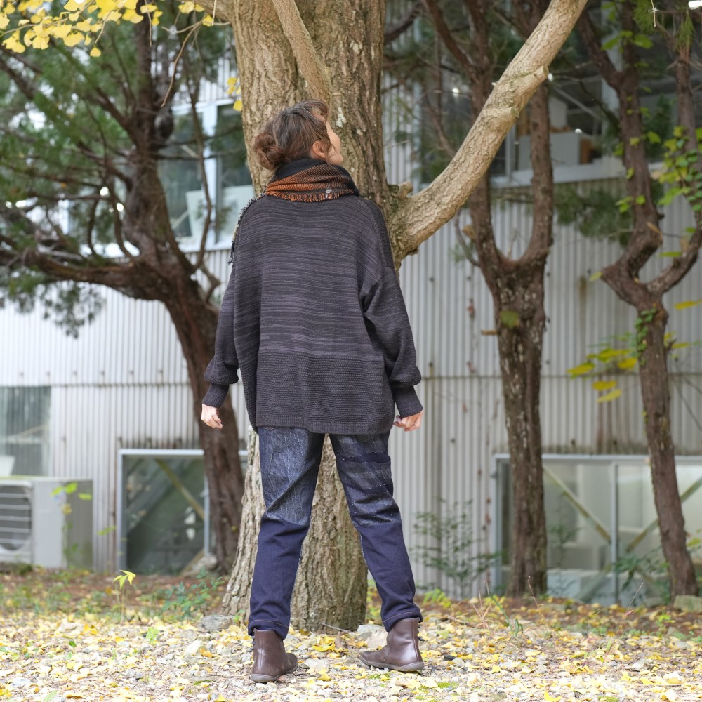 A new frontier of deniime, born by trying plain weave. It looks like there are mountains and valleys on the fabric, so we named it une meaning ridge. If we weave it in one color, you can feel the "ridge" to the touch, and if we use bright colored threads on the lining, the "ridge" will appear. It looks hard, but the back side which touch your skin is soft.