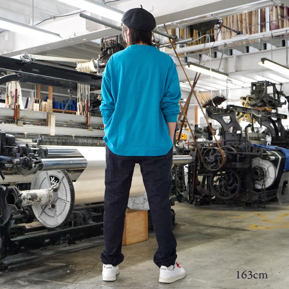 “やわらかさ”にとことんふりきることで、らくちんかっこいいデニムができました。厚みがありながら軽くやさしい肌触り。綾織をベースに2枚の生地をつなぎあわせる、横二重織りを取り入れて細かく接地点をとることで、ニットのような伸縮性のある生地に。これまでのデニムの限界を超えて伸び良くやわらかく。スラブ糸に無撚糸を組み合わせた生地もお目見えします。