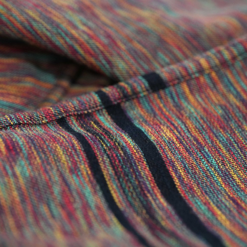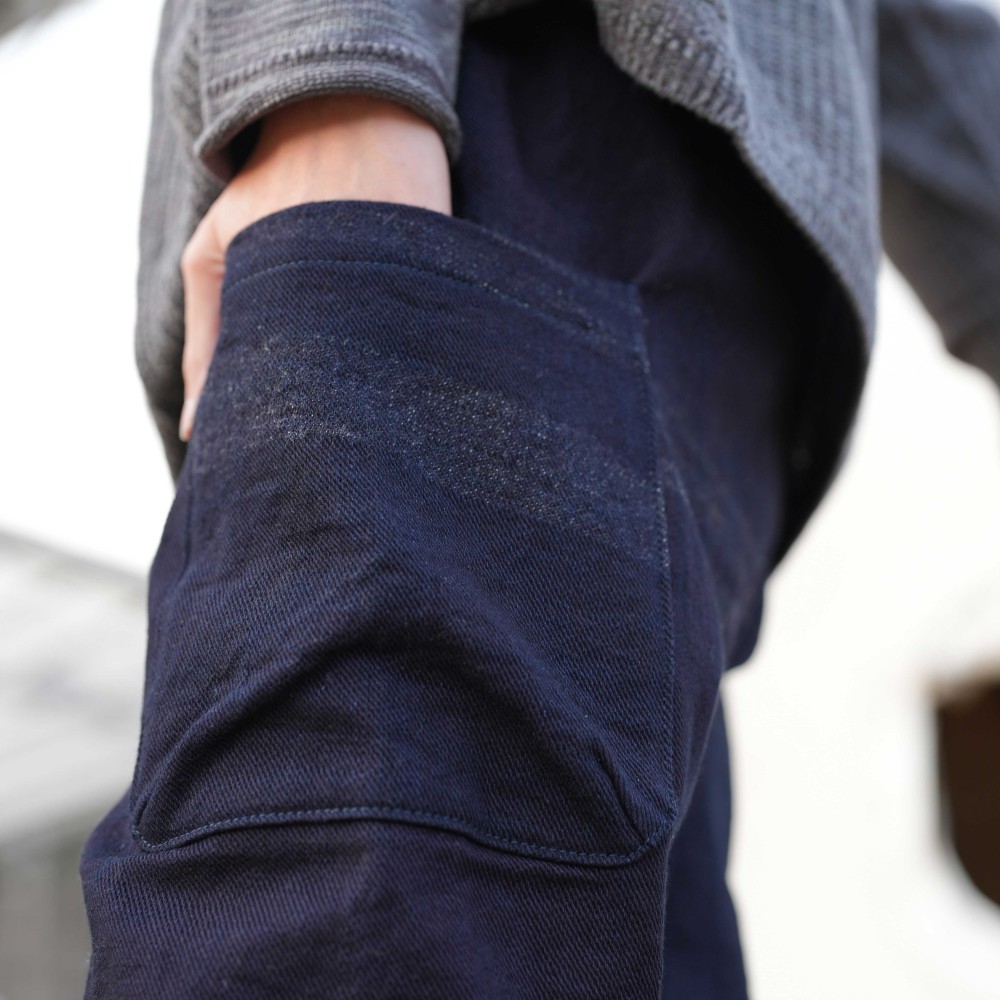 これまでつくりあげてきたデニムの中でも群を抜いて、やわらか。綾織をベースに、色が主役になるように緯糸を表地にがっつりと出しきれいに見える形、大きさ、配置を追及しました。刺し子のような、手仕事感のある色が主役の、デニム。