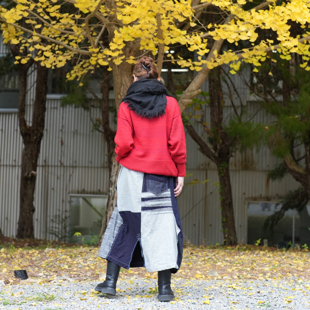 A new frontier of deniime, born by trying plain weave. It looks like there are mountains and valleys on the fabric, so we named it une meaning ridge. If we weave it in one color, you can feel the "ridge" to the touch, and if we use bright colored threads on the lining, the "ridge" will appear. It looks hard, but the back side which touch your skin is soft.