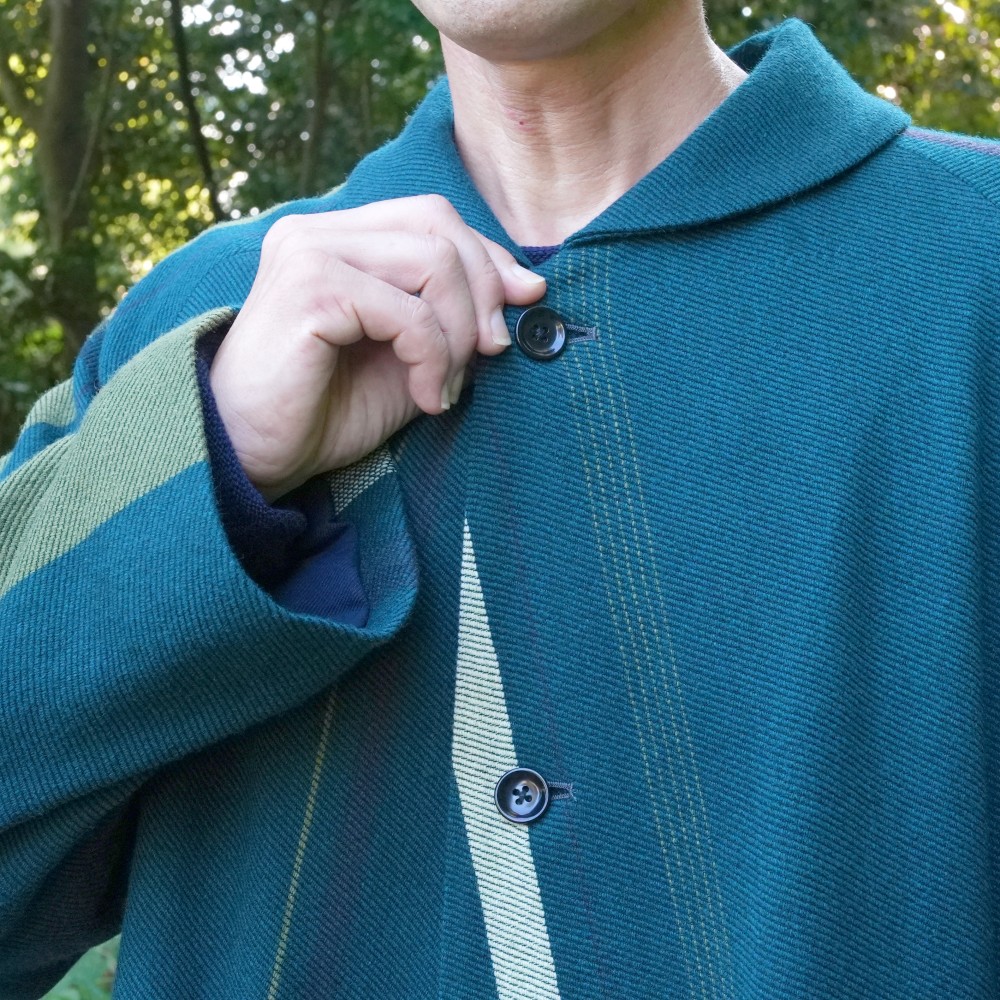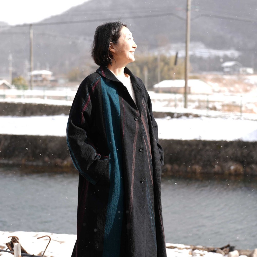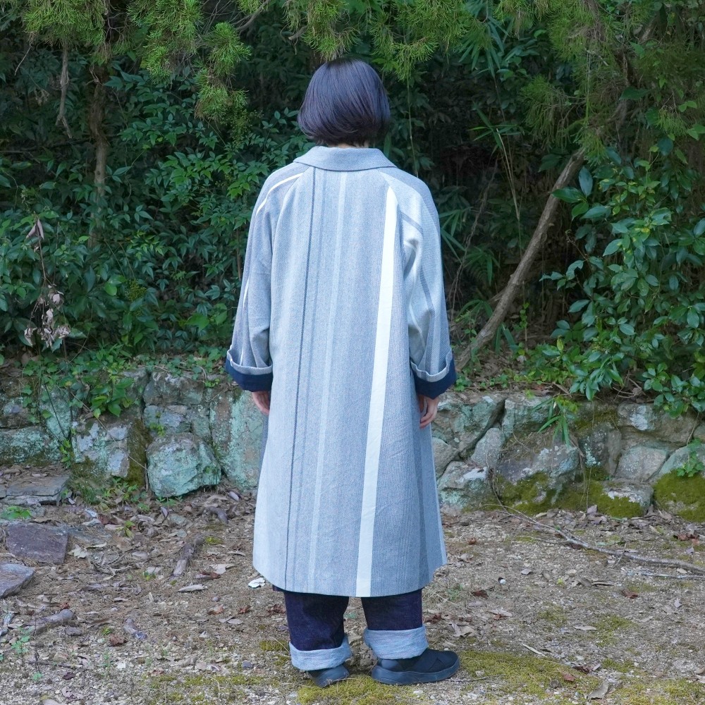A luxurious coat constructed from a single length of cloth that wraps around, this is an heirloom piece made to be worn many times. The simple, minimalist design allows the fabric’s color and pattern to be fully appreciated. The collar and coat length are thoughtfully considered to suit both men and women.
