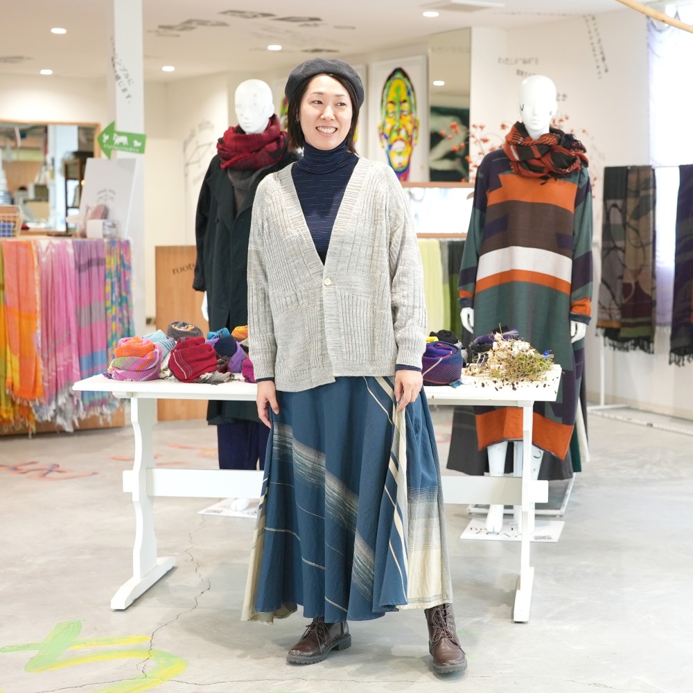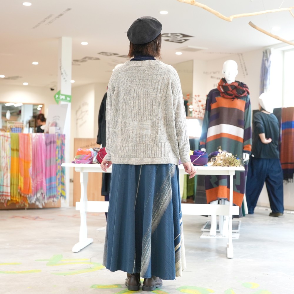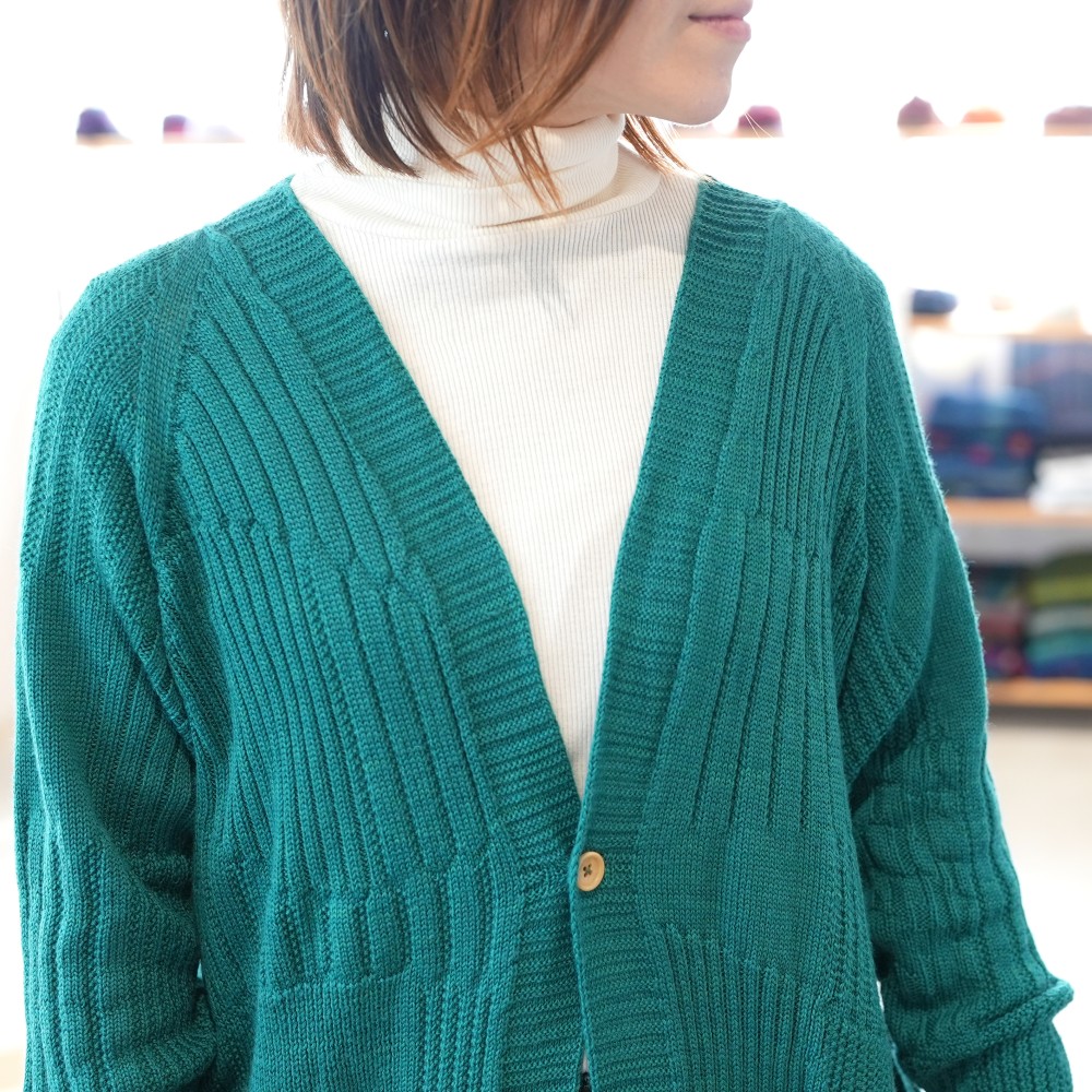 A knitted cardigan with a single button at the front, a design we’ve revisited in response to requests. Fastened or unfastened, either way it’s cute and comfortably warm. It features tamaki niime’s distinctive textured knit and with a shorter length it's the perfect balance to pants and dresses.