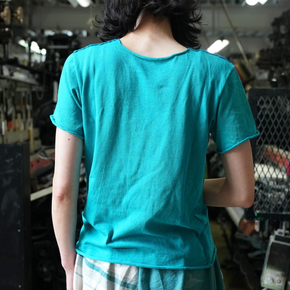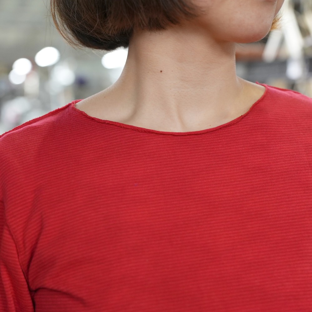 This reversible short-sleeve version of ‘nuime-kuru-hoso’ is created with the same gentle, soft touch as our ‘maru-t,’ slowly knit on a circular knitting machine for exceptional comfort.