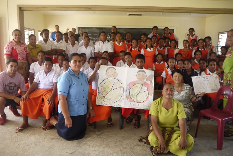 そこで、これからの人生を考えるきっかけにして欲しいと思い、私の住む島のHigh school のうちの一つ、Tailulu Collegeにてworld cancer day のイベントを行いました。癌や生活習慣病のお話(病院スタッフより)、肥満になるの食べ方のお話(私がポスターを使いながら行いました)、そしてズンバ(ボランティアさんより)です。